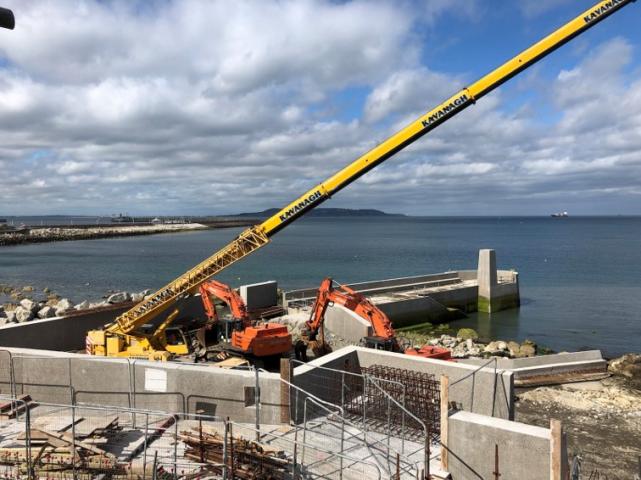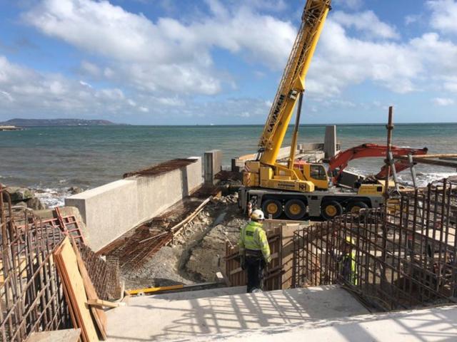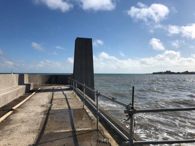 The project is divided into several work zones. These zones include work to the new jetty, works to the new sea walls, works to the Pavilion and works to tie into the existing walkway at Newtownsmith. Currently works to the new jetty are nearing completion. This has created a new viewing point with stunning vistas across Scotsman’s Bay to Sandycove Harbour. The new long bench on the jetty has been also been completed which is inspired by the sitting bench where swimmers relax overlooking Sandycove Harbour. The new Casement Memorial Sculpture by the sculptor Mark Richards is complete and is dramatically sited on a plinth at the end of the jetty.