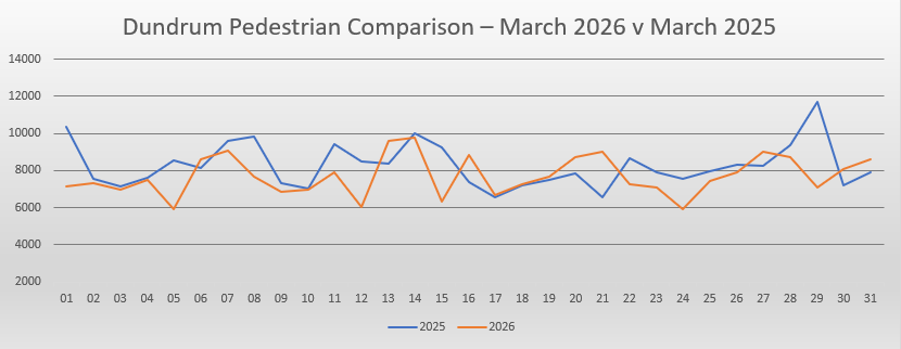 There was a 7% decrease of footfall in Dundrum compared to March 2025. The footfall in the area generally follows an expected pattern, with higher footfall going into the weekends. Weather has major influence on the footfall where adverse weather conditions days usually limits the footfall numbers. The highest recorded footfall was on Saturday 14th March with a total of 9,769. Below is the footfall comparison performance chart for the month of March in Dundrum.