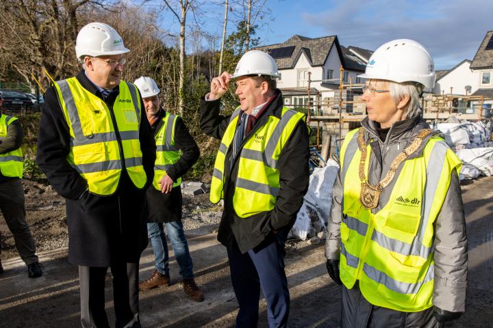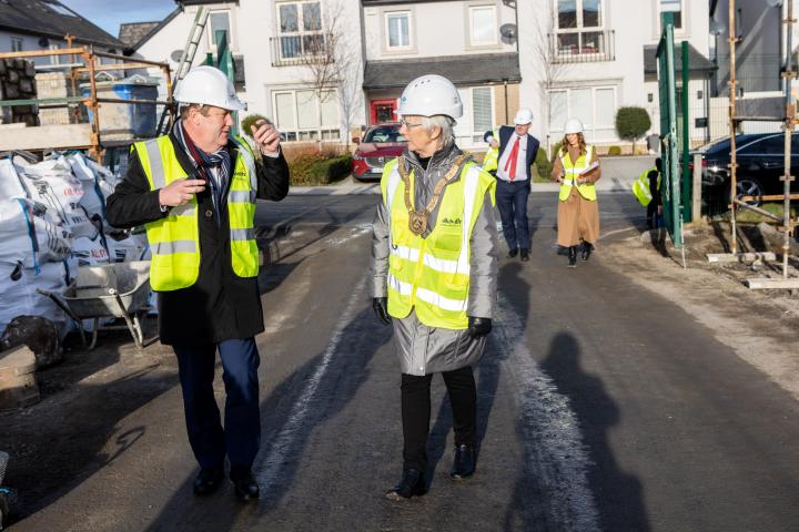 Today, Councillor Mary Hanafin, Cathaoirleach and Frank Curran Chief Executive, Dún Laoghaire-Rathdown County Council welcomed Darragh O’Brien, Minister for Housing, Local Government & Heritage to Kiltiernan for an official visit to the Bishop’s Gate development site, where 72 cost rental homes are under construction. In addition to the cost rental homes, Tuath will also deliver a further 22 social homes on the same site and these will be allocated to people from the Dún Laoghaire–Rathdown County Council housing waiting list upon completion.