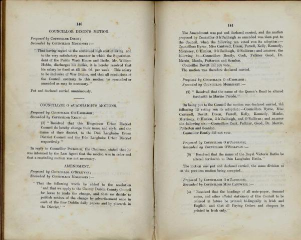 Council Minutes from the Urban District of Kingstown reveal that the change was proposed by Seán Ó hUadhaigh from the Kingstown Township on 6 July 1920, later confirmed by Dublin County Council on 24 July 1920 and acted upon a month later on 5 August 1920. At the same meeting on 6 July, several other name changes were proposed and carried, including that ‘the name of the Royal Victoria Baths be altered forthwith to Dún Laoghaire Baths’.