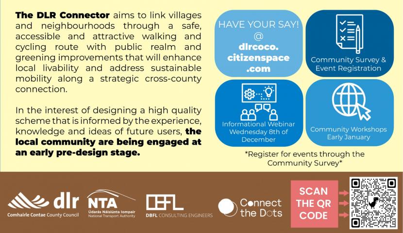 The DLR Connector aims to connect villages and neighbourhoods through a safe, accessible and attractive walking and cycling route with the public realm, and greening improvements that will enhance local livability and address sustainable mobility along with a strategic orbital connection across the County. Please see the proposed route below: