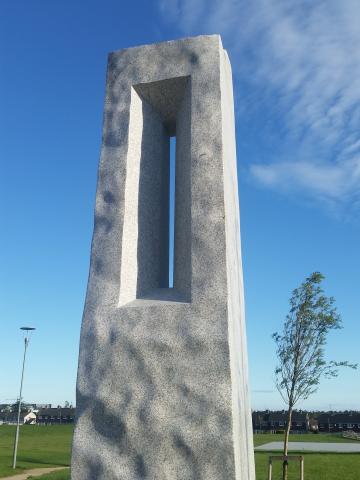 This sculpture was commissioned as part of the new Civic Campus and the artist was asked to take inspiration from the life and/or work of Beckett. Eileen MacDonagh, who was awarded the commission, created a large-scale sculpture from granite – a material which has been so important in shaping the landscape of the area. Beckett was born in the area, very close to the site of the Civic Campus, and it influenced his work to a large degree.